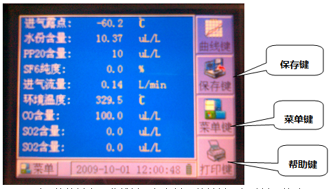 進入“測量界面”后,軟按鍵有:曲線鍵、保存鍵、菜單鍵、幫助鍵。按動相應的按鍵可以進入“曲線界面”、“保存界面”,“菜單界面”,“幫助界面”。同時,你也可以看到露點、水份含量、壓力、流量、環境溫度、SO2、H2S、CO、PP20等測量值。