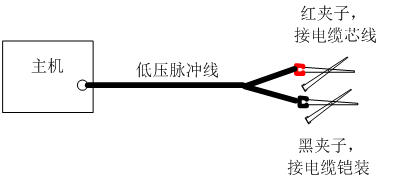 低壓脈沖測試法只需要將低壓脈沖線有插頭的一側插入主機“信號”接口。測試線的紅色夾子夾在A 、B、 C 三相的某一相上, 黑色夾子夾在電纜的“鎧裝”上面。